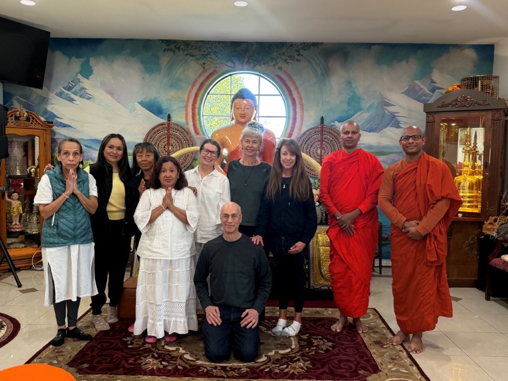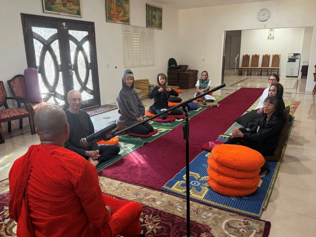 January 2026: We had a 1 day retreat Saturday January 17th from 9am to 5pm at Sambuddhaloka Vihara Buddhist temple near Riverside thanks to the abbot, Ven. Bhante Saranasiri. The prestigious scholar (Royal Pandit and PhD) Bhante Kemananda, gave us a dharma talk at the start. Later we were welcomed by the temple lunch dana supporters and received blessing strings from the Bhantes Kemananda, Sarananda and Yanaratna. In addition to meditating in traditional posture for a couple hours, the 8 of us meditated in a few alternatives including walking around the temple grounds and Bodhi tree. (see also photos on Facebook)